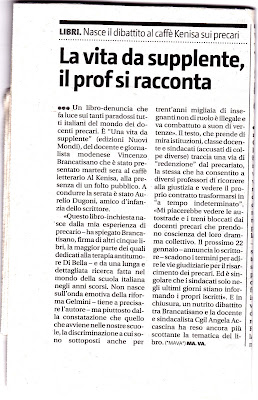 Presentazione del libro di Vincenzo Brancatisano "Una vita da supplente" a Messina, a cura del Comitato insegnanti precari CIP ME. Intervista di Chiara Miccoli per il settimanale Centonove.